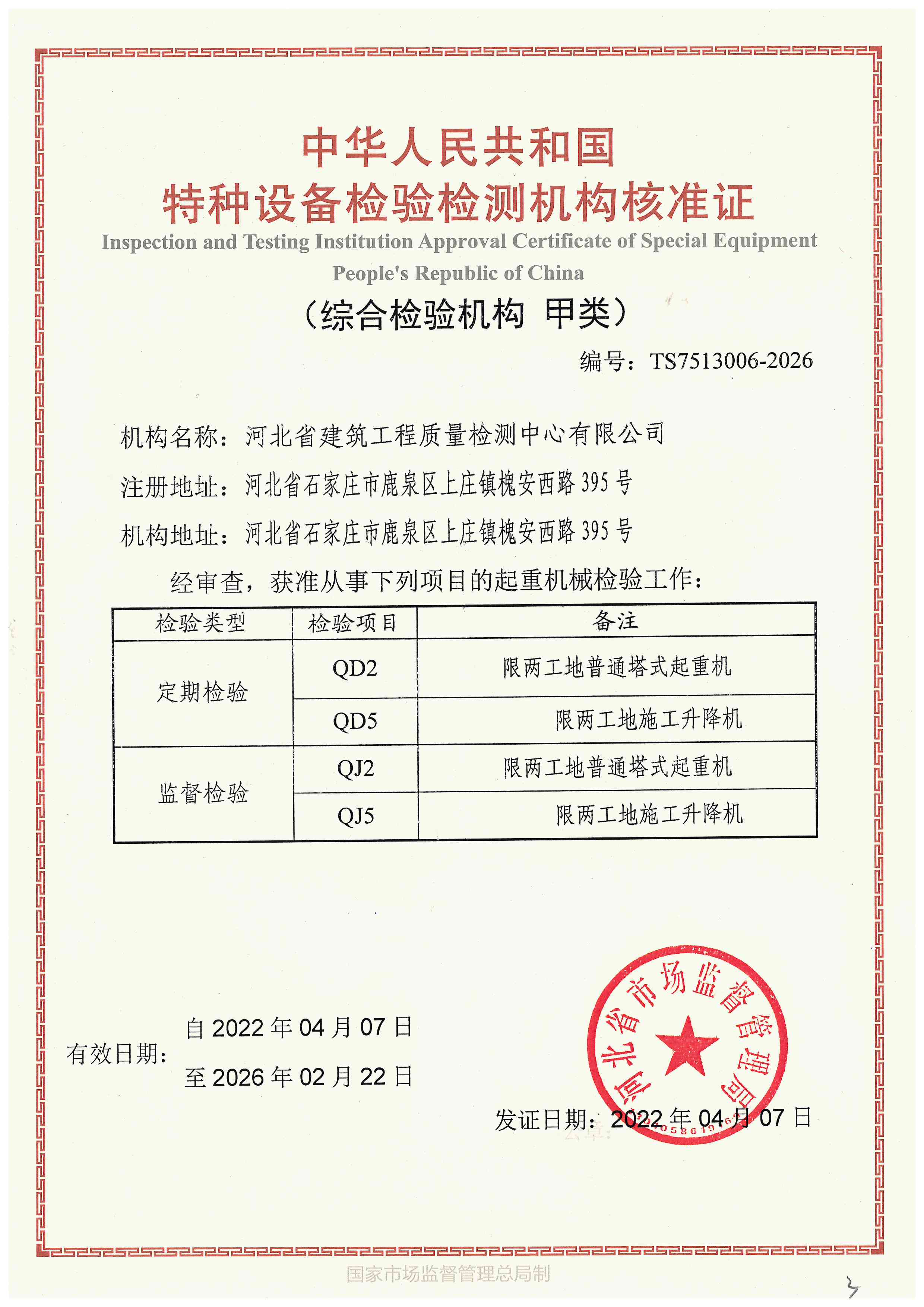 河北省建筑工程質(zhì)量檢測中心特種設(shè)備檢驗檢測機構(gòu)核準(zhǔn)證